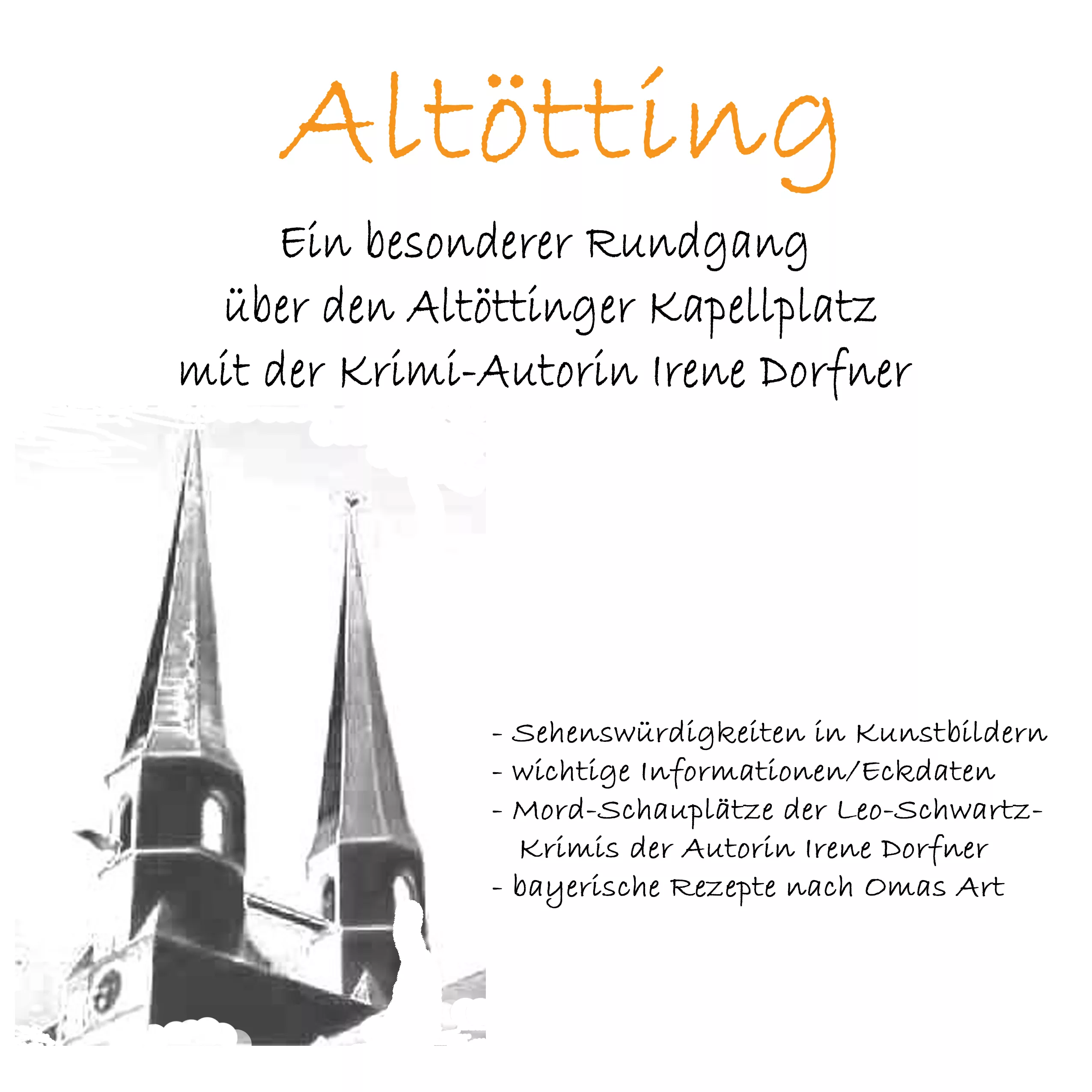 Kommen Sie mit auf einen besonderen Rundgang über den geschichtsträchtigen, mystischen, einmaligen, wunderschönen und äußerst interessanten Kapellplatz in Altötting mit der ortsansässigen Krimi-Autorin Irene Dorfner.